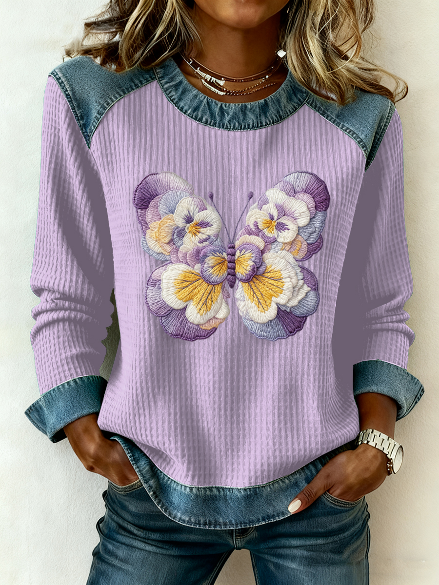 Women's Floral Butterfly Denim Patchwork Top